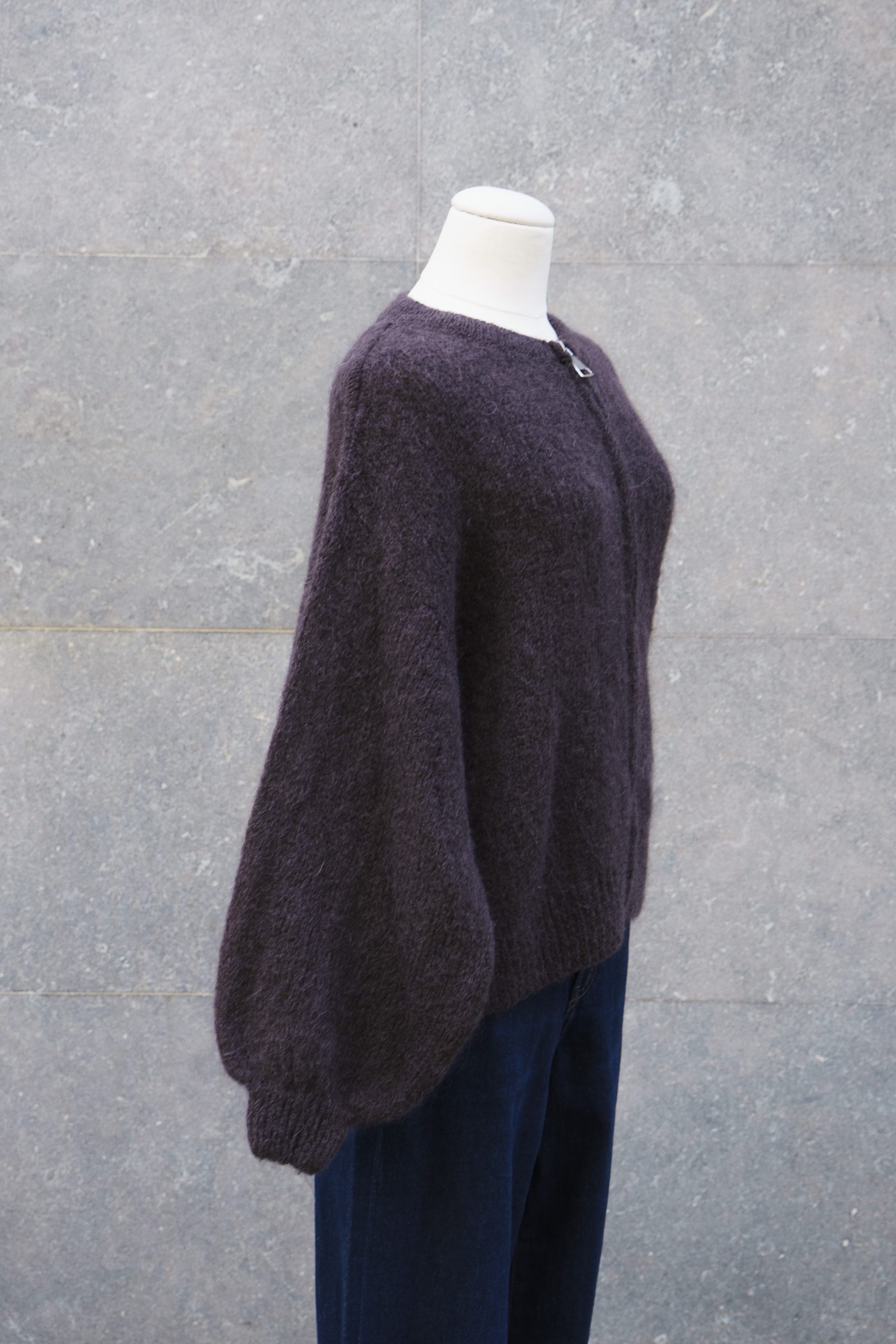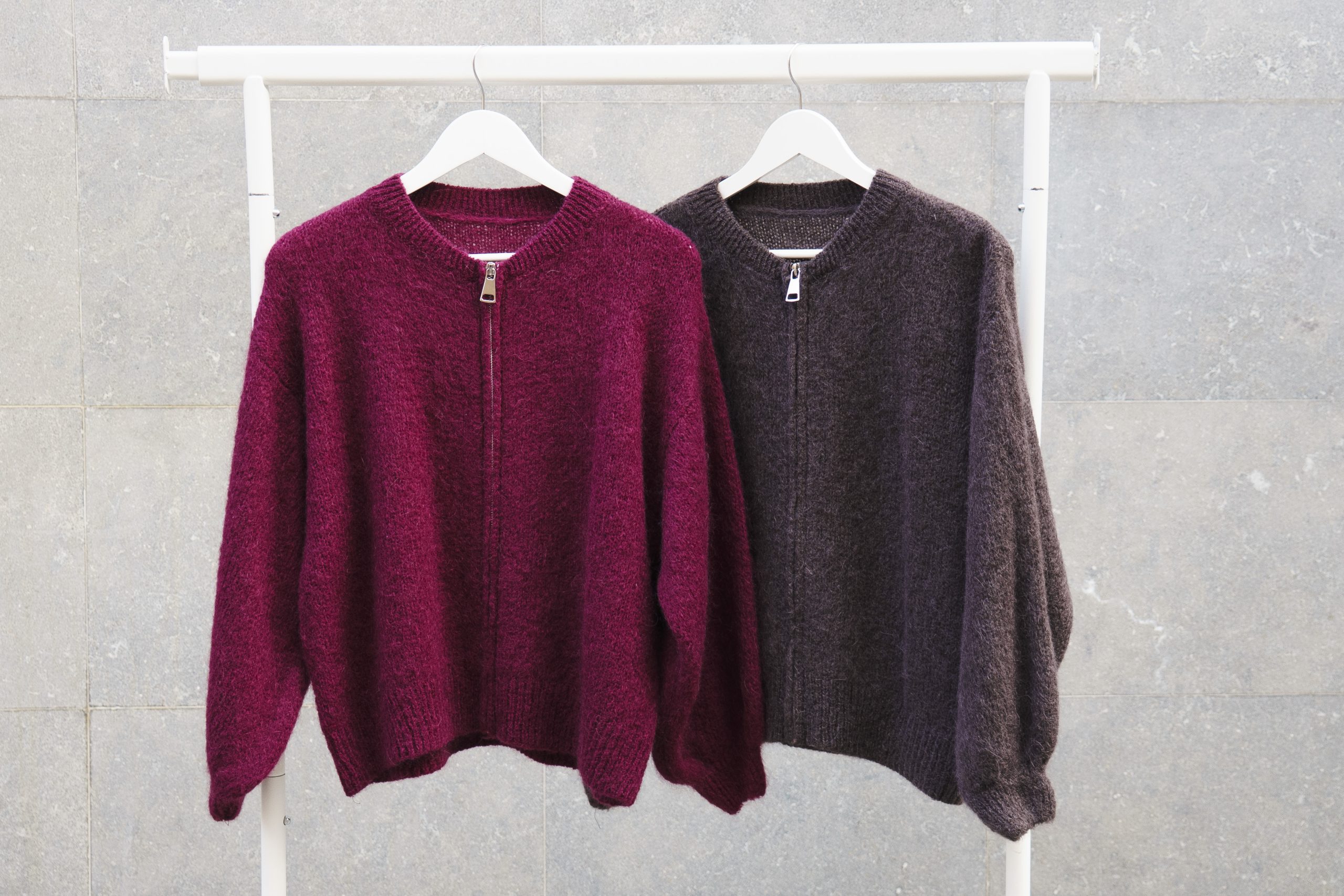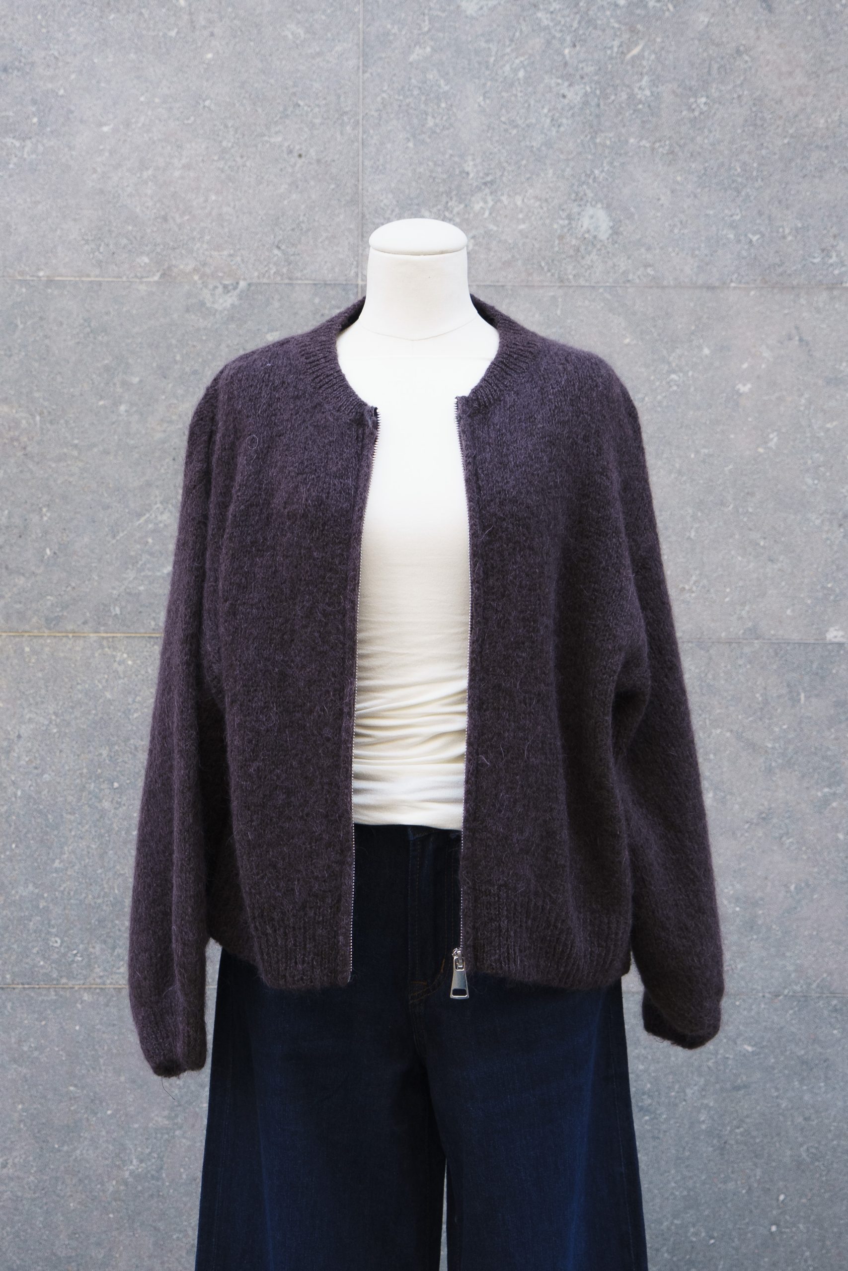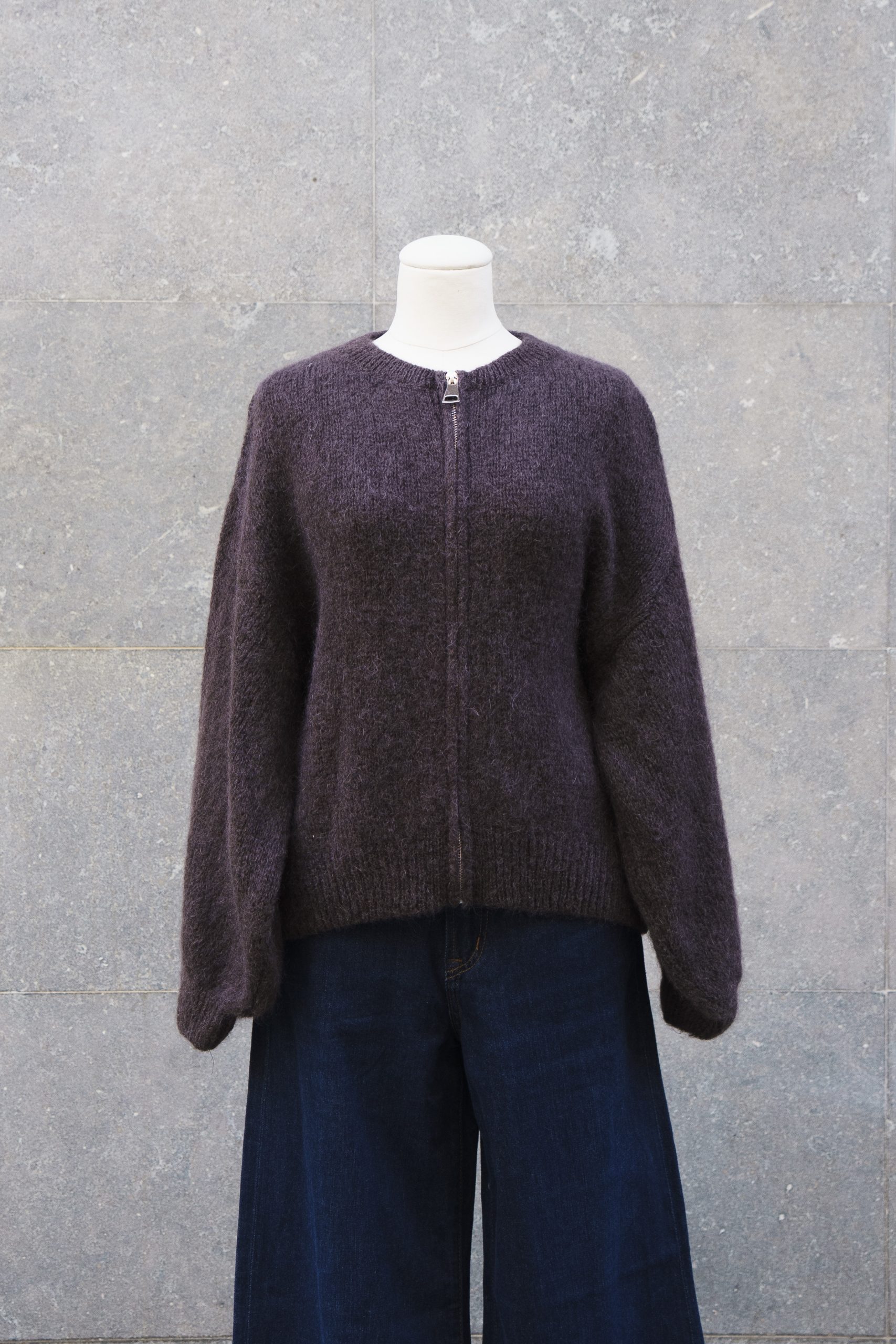 Cárdigan cerrado con cremallera frontal y cuello redondo. Diseño limpio y cálido, disponible en burdeos y marrón