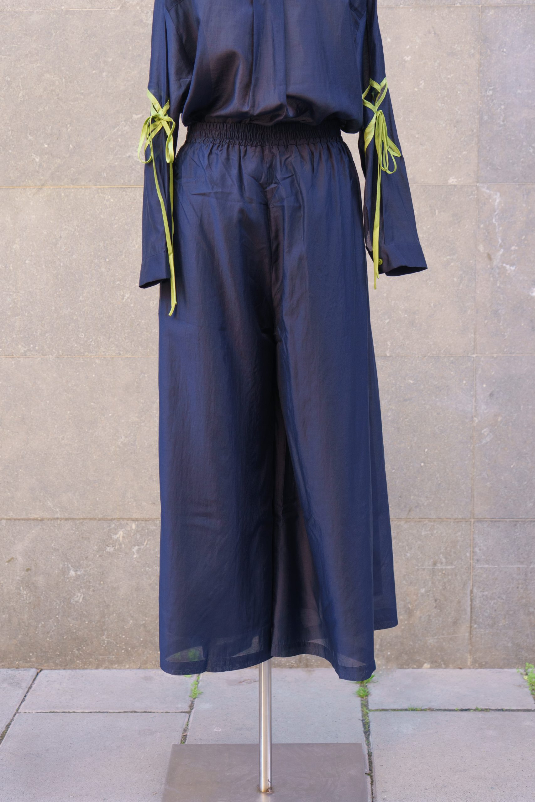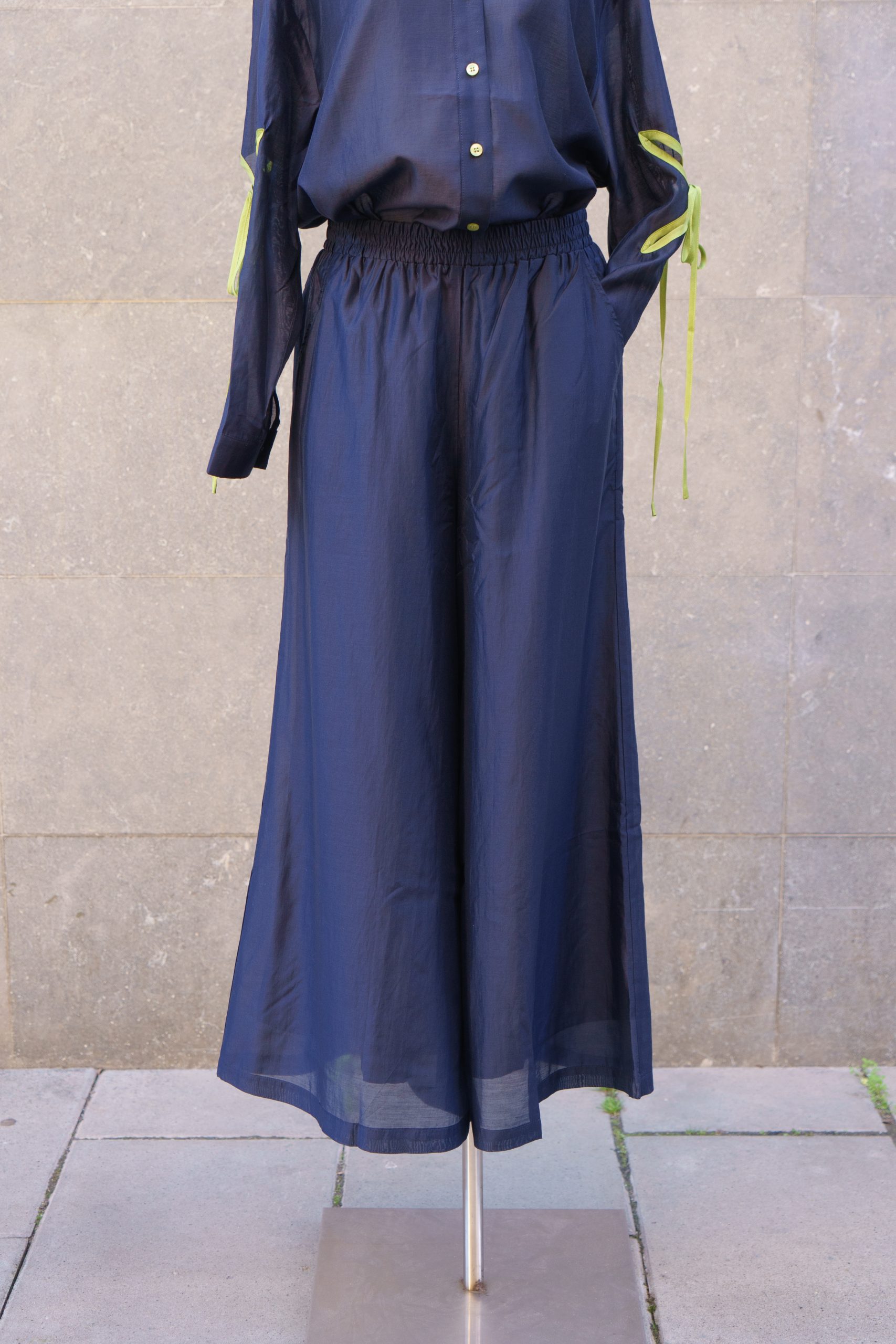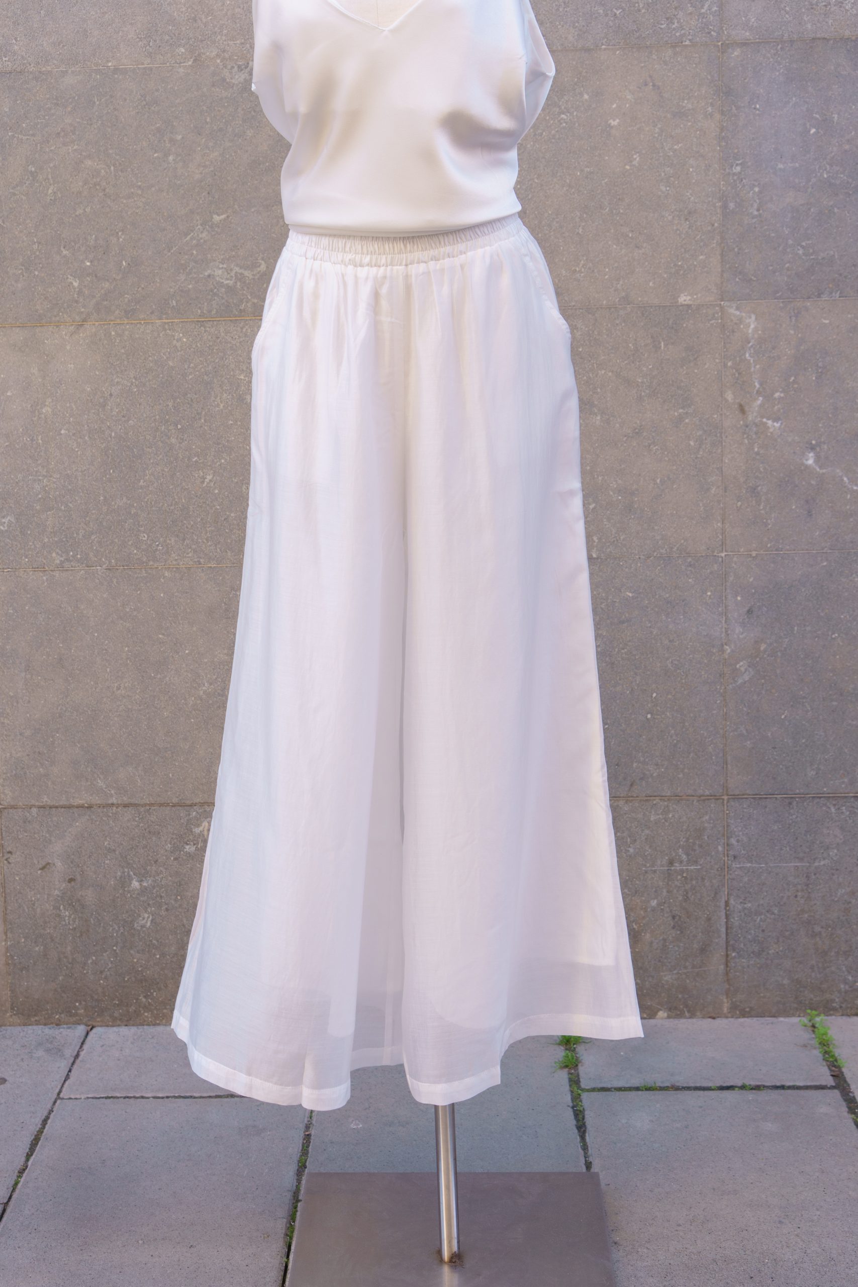 Pantalón de pernera ancha y caída ligera, confeccionado en tejido suave y vaporoso. Cuenta con cintura elástica que aporta comodidad y un ajuste favorecedor. Elegante y versátil, ideal para combinar tanto con blusas como con camisetas básicas.